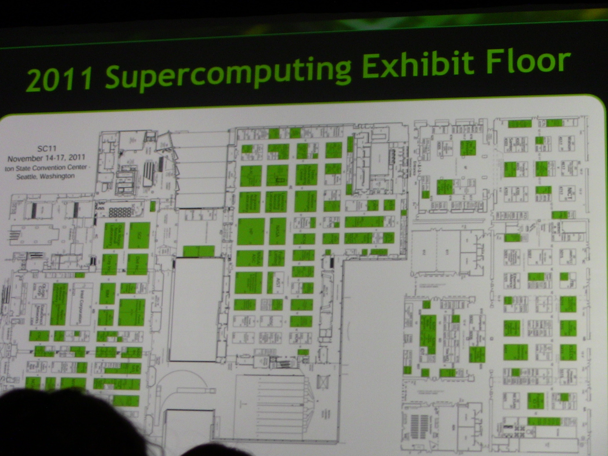Fast-forward four years and… look at the progress. The SC11 show floor diagram is literally covered with green squares and rectangles. One of those squares is NVIDIA’s own booth, of course; but what about all the others? (Read more below…)