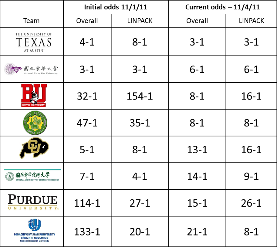 There have been big (big) changes in the odds since we opened up the Student Cluster Competition (SCC) 2011 betting pool to the public. (For details on the SCC and the teams, click here.) The betting has tightened up the field as SCC fans pick their favorites to win both the Overall Prize and the LINPACK portions of the fight.