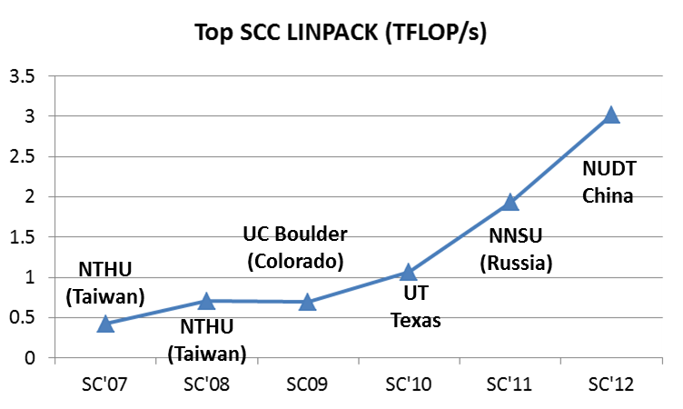 Salt Lake City is abuzz with the news that China’s NUDT team has once again snared the LINPACK crown at a student cluster competition. Their record-breaking score of 3.014 TFLOP/s topped their competitors and marked the first time a student cluster team has broken through the 3 TFLOP/s barrier.