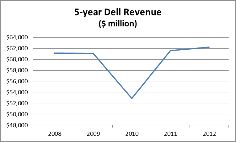 Value and the perception of value is the real reason behind Dell becoming Private Dell. Here’s a look at Dell’s revenue over the past five years. Note the big dip in 2010 – ouch. But also note that revenue in 2012 at $62.2 billion is marginally higher than the $61.1 billion they cash registered in 2008.