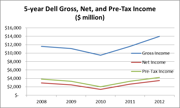 We see the same pattern in Net Income and Pre-Tax Income. Both of these numbers drop in 2010 but then rise again in 2012 by about the same amount. Dell’s net income was $2.95 billion in 2008 and $3.5 billion in 2012 – an increase of 18.6%. That ain’t bad at all.