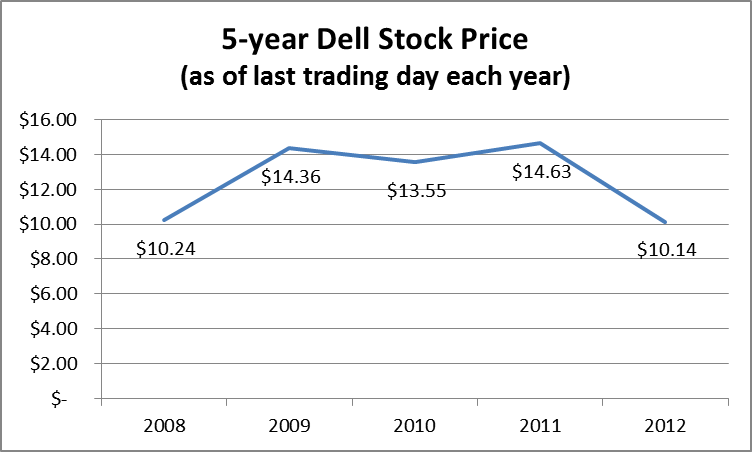 What happened to Dell’s stock price during this period? It was a round trip, closing at $10.24 per share on the last trading day of 2008 and hitting $10.14 the last trading day of 2012. Dell doesn’t pay dividends, so the only return that investors will see is appreciation in their stock price.